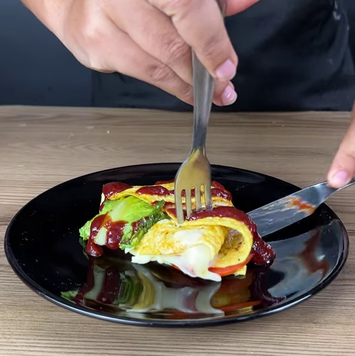 - Depois faço um corte até o meio no ovo, adiciono 1 fatia de queijo muçarela, 1 fatia de presunto, 1 folha de alface, 3 rodelas de tomate, vou fechar e espera o queijo derreter.