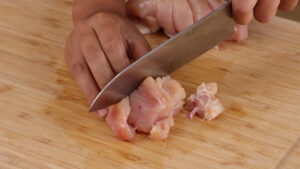 • Para esta receita, vou começar cortando 500 gramas de filé de peito de frango em tiras e depois em cubos.