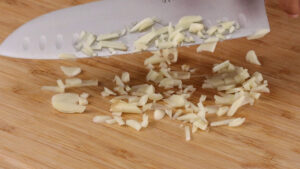 • Em seguida vou cortar 3 dentes de alho em pedaços bem pequenos.