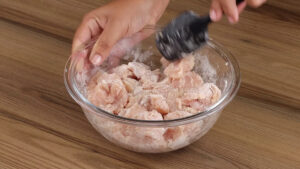 • Após isso vou passar todo o frango para uma tigela e vou adicionar 1 colher de chá de sal, ½ colher de chá de pimenta do reino, 2 colheres de sopa de farinha de trigo, depois vou misturar bem esses ingredientes.