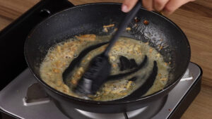 • Depois de frito vou retirar todo esse frango da frigideira e vou adicionar 50 gramas de manteiga. Agora vou mexer para que essa manteiga se derreta. Em seguida vou adicionar o alho e refogar. Quando o alho já estiver dourado vou adicionar 1 colher de chá de salsa desidratada, 1 colher de sopa de farinha de trigo e vou misturar.