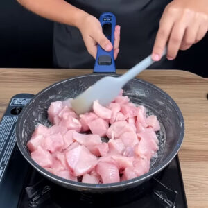 • Para começar, numa frigideira ao fogo untada com manteiga, vou adicionar 2 peito de frango picados e deixar fritar.
