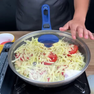 • Em seguida coloco a mistura no frango já frito, deixo em fogo baixo, adiciono rodelas de tomate, queijo muçarela ralado, tampo e deixo cozinhar até o queijo derreter.