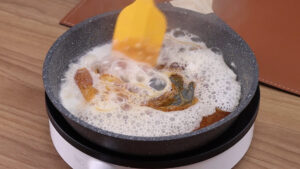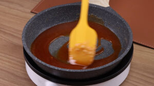 • Para começar em uma frigideira vou adicionar 1 xícara de açúcar e vou mexer bem até virar uma calda.
