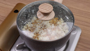 • Agora em uma panela vou adicionar 1 colher de sopa de manteiga, e esperar derreter. Vou adicionar 1/2 xícara de milho de pipoca. Vou mexer, tampar e esperar que esse milho estoure.