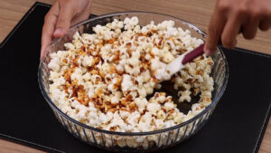 • Agora vou passar tudo para uma travessa, despejar a calda que fizemos e misturar para que a pipoca se agregue bem a calda.