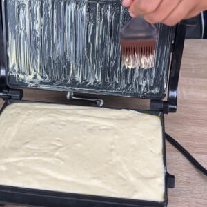 • Vou colocar a nossa massa (ingredientes no final do vídeo) na sanduicheira já esquentando. Vou colocar um pouco de manteiga na parte de cima da sanduicheira. Vou fechar e deixar assar por 3 minutos.
