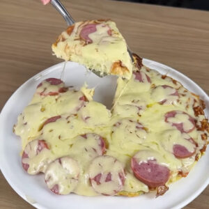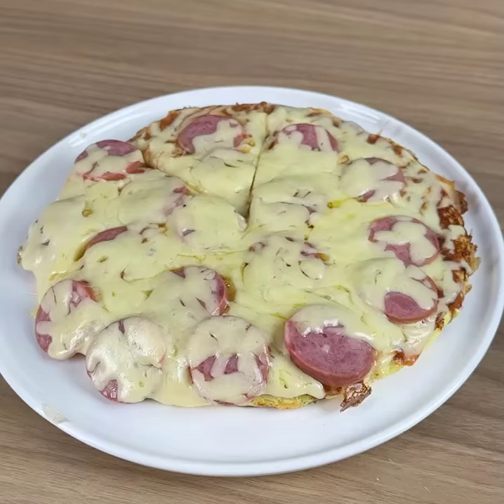 • Vou adicionar molho de tomate, queijo muçarela ralado, rodelas de calabresa e novamente queijo muçarela ralado.