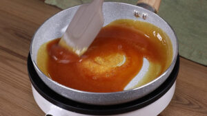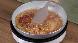 • Agora em uma frigideira vou adicionar 1 xícara de açúcar e vou mexer até formar uma calda.