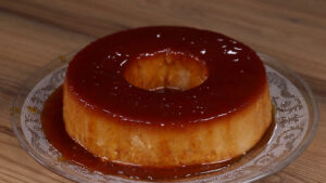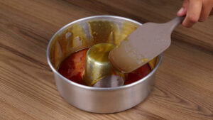 • Em seguida vou adicionar essa calda em uma forma e espalhar bem por todo esse recipiente.
