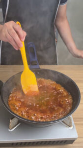 - Vou começar a nossa receita colocando em uma frigideira já em fogo médio o açúcar, e mexendo até que se caramelize. Adicionarei aos poucos a água, e vou continuar mexendo até dissolver. Vou passar esse caramelo que fiz para uma forma.