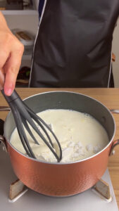 - Agora em uma panela com fogo desligado vou adicionar o nosso leite condensado, o amido de milho, a essência de baunilha, o creme de leite e próprio leite. Vou ligar o fogo e mexer tudo isso até que fique homogêneo.