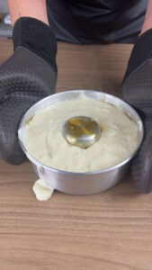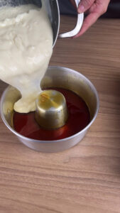 - Colocarei todo o conteúdo da panela na nossa fôrma caramelizada.