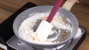 - Para começar vou adicionar em uma frigideira 1 xícara de açúcar e vou mexer bem até que esse açúcar se derreta.