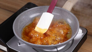 - Depois vou adicionar 1/2 xícara de água e vou mexer novamente para que essa calda fique mais fina.