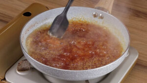 - Para começar, em uma frigideira vou adicionar 240 gramas de açúcar e vou mexer até que esse açúcar se derreta por completo.