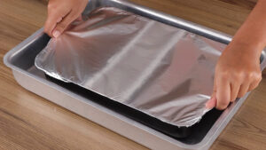 - Agora vou cobrir com papel alumínio, adicionar essa fôrma em um recipiente maior e adicionar água até o meio. Por fim vou levar ao forno a 220 graus por 90 minutos.