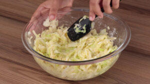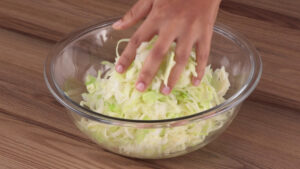 - Para começar, vou cortar 1 repolho ao meio e depois em tiras. Depois vou passar todo esse repolho para uma tigela e adicionar água quente.