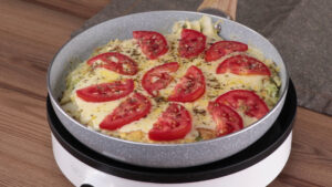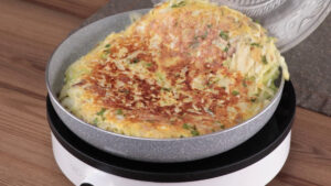 - Quando um lado estiver pronto, vou virar com ajuda de um prato para fritar o outro lado. Você também pode colocar queijo muçarela e tomate a gosto.