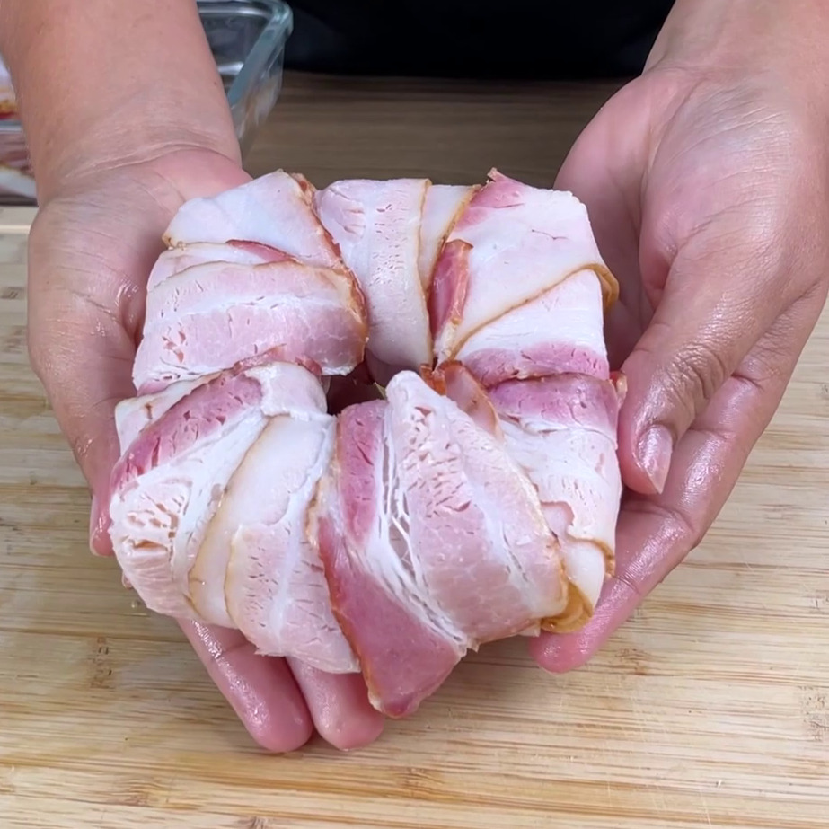 - Para começar a nossa receita, pegarei queijo muçarela e queijo cheddar a gosto em fatias e empilhados. Com um cortador abrirei um espaço no meio do queijo e depois vou enrolar algumas fatias de bacon a gosto no queijo.