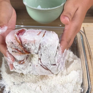 - Depois vou colocar um pouco de pimenta do reino e transferir para uma pequena travessa. Vou adicionar 1 tigela de farinha de trigo e empanar.