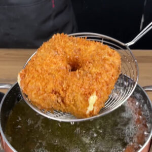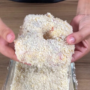 - Agora vou usar outra vasilha e colocarei 1 tigela de farinha de rosca e novamente vou empanar. Em seguida vou colocar no óleo quente para fritar sempre virando os lados para não queimar.