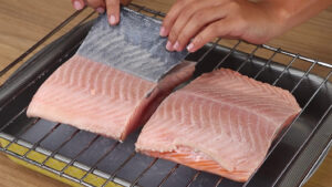 - Para esta receita vamos precisar de 400 gramas de salmão. Vou despejar água quente sobre esse salmão. Para que a pele saia com mais facilidade.