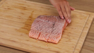 - Em seguida vou passar esse salmão para uma tábua e vou cortá-lo em pedaços médios. Vou temperar com sal a gosto, pimenta do reino a gosto e vou espalhar bem esses temperos.