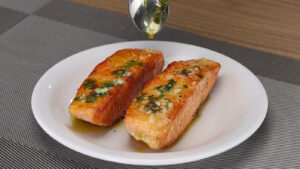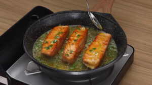 - Para continuar vou retirar esse salmão da frigideira e vou reservar. Agora em outra panela vou adicionar 120 gramas de manteiga e vou mexer para que essa manteiga se derreta por completo. Após isso vou adicionar 1/2 colher de chá de sal, 1/2 colher de chá de pimenta do reino, 1 dente de alho picado, o suco de 1/2 limão, cheiro verde a gosto e vou misturar. E quando esse molho estiver fervendo vou adicionar o salmão. Para ficar ainda mais saboroso, vou pegar um pouco desse molho com uma colher e vou despejar por cima do nosso peixe.