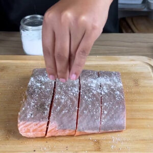 - Para começar, vou dividir um filé de salmão em 4 partes, temperar com sal e pimenta do reino.