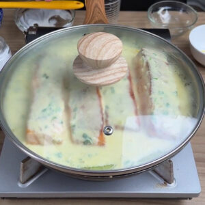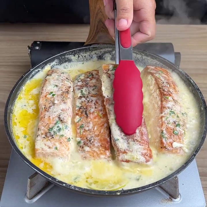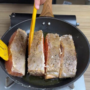 - Vou virar e fazer o mesmo do outro lado do salmão. Depois vou colocar numa frigideira com azeite e esperar dourar de ambos os lados.