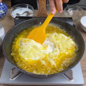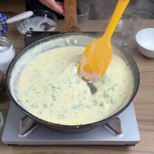 - Na frigideira vou adicionar margarina e derreter, adicionar 1 cebola picada, 3 dentes de alho picados e mexer. Adiciono 100ml de água, 200ml de creme de leite, 100g de queijo muçarela ralado e vou mexer novamente.