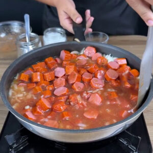 - Para começar, numa frigideira com 500g de salsichas cortadas e 1 cebola picada vou adicionar 340g de molho de tomate, 1 colher de sal, 1 colher de pimenta do reino, 100ml de água e deixar cozinhar por 3 minutos.