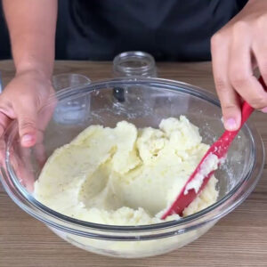- Em uma tigela adiciono 1kg de batata já cozida e vou amassar. Depois adiciono 60ml de leite, 2 colheres de amido de milho, 1 pitada de pimenta do reino e misturo bem.