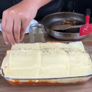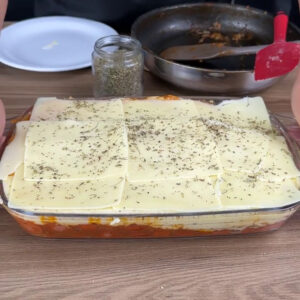 - Vou colocar as salsichas num recipiente, adicionar o purê e espalhar. Depois adiciono fatias de queijo muçarela e orégano.