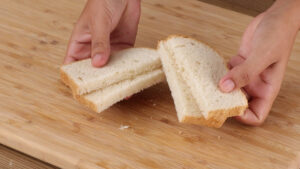 - Para esta receita, vamos precisar de 2 fatias de pão de forma. Vou começar passando manteiga nessas fatias. Em seguida, vou cortar essas fatias em pedaços pequenos.