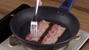 - Para continuar, em uma frigideira vou adicionar 2 fatias de bacon e deixar fritar.