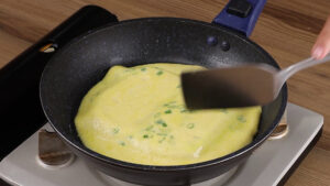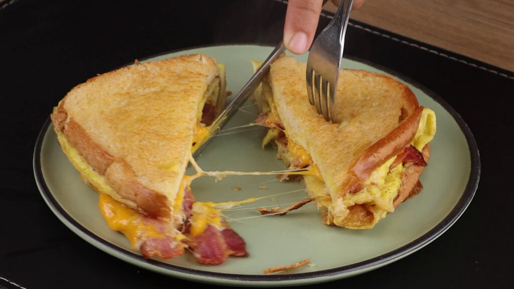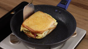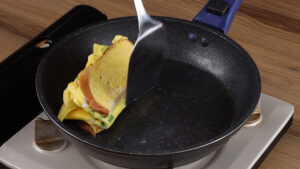 - Quando um lado estiver pronto, vou virar e adicionar o bacon, o presunto, e o queijo. Vou fechar e retirar da frigideira.