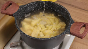 - Para esta receita, vou começar cortando 3 batatas em cubos. Agora vou passar essas batatas para uma panela, adicionar água até cobrir, 1 colher de chá de sal, e vou deixar cozinhar.
