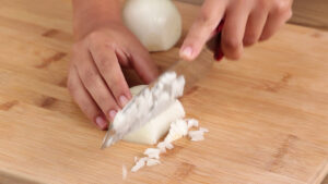 - Vamos precisar também de 1 cebola, vou cortar essa cebola em pedaços pequenos.