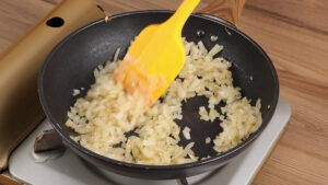 - Para continuar, em uma frigideira vou adicionar 1 colher de sopa de manteiga, a cebola picada e vou refogar.