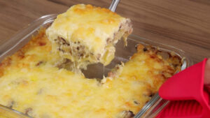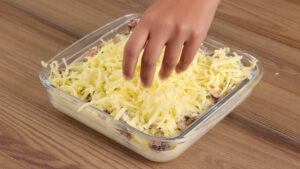 - Vou adicionar também a mistura que fizemos, 100 gramas de queijo muçarela ralado, e vou levar ao forno a 200 graus por 40 minutos.
