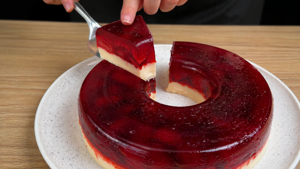 • Adicione a gelatina de morango e misture até dissolver completamente. Deixe esfriar.