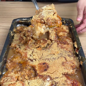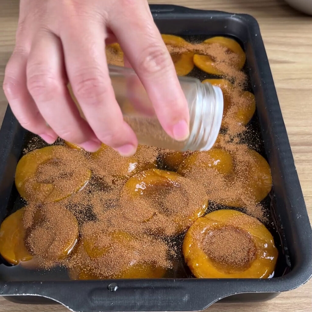 - Para começar, em uma forma retangular vou adicionar 2 latas de pêssego, colocar por cima canela, e também adicionar noz moscada.