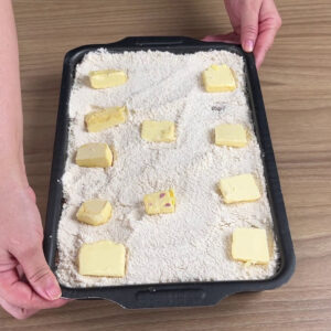 - Depois eu vou adicionar a massa já preparada (na massa temos 1 ovo e manteiga também) e em seguida colocar sobre essa massa pedacinhos de manteiga. Vou levar ao forno por 40 minutos.