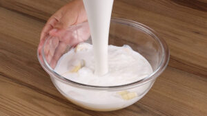 - Para começar vou cortar 1 banana em rodelas. Em seguida vou passar essa banana para uma tigela e vou adicionar 100 gramas de leite condensado, 200 ml de chantili e com ajuda de um mix vou misturar esses ingredientes.