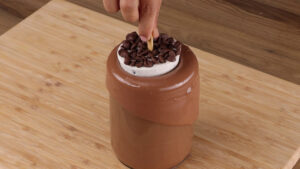 - Por cima vou colocar mais gotas de chocolate. Vou colocar palitos de madeira e levar na geladeira até ficar firme.