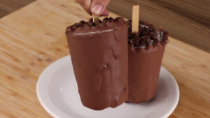- Após isso, em um pote vou adicionar chocolate derretido a gosto, e vou mergulhar cada sorvete aqui dentro. Por fim vou levar na geladeira novamente até essa cobertura ficar firme.
