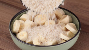 - Para esta receita, vamos precisar de 6 bananas. Vou cortá-las em rodelas. Após isso vou passar essas bananas para uma tigela e adicionar 1 xícara de arroz.