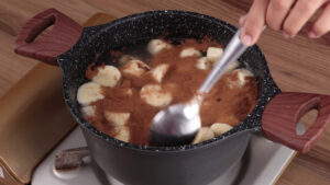 - Agora vou passar essa mistura para uma panela, adicionar água até cobrir, 1 colher de chá de canela em pó, vou misturar, tampar e deixar cozinhar por 20 minutos em fogo alto.